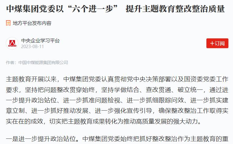 【學習強國】中煤集團黨委以“六個進一步” 提升主題教育整改整治質量