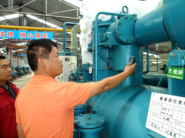 班組進行安全隱患排查,班長正在檢測滅火器壓力是否達標